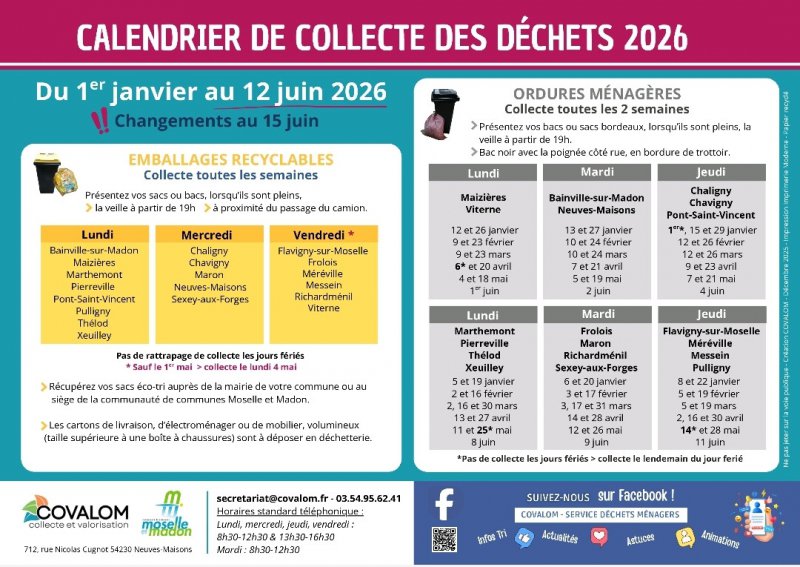 Calendrier Covalom - Service déchets ménagers du 1er janvier au 12 juin 2026, horaires de la déchèterie de Messein